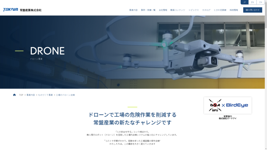 【常盤産業株式会社】ではドローンを活用した工場内点検システムにチャレンジしています。目視不可能な場所の確認や工場内の傷(高所の破損箇所)の確認等にご利用いただけます。ドローンを利用した工場内設備点検のご提案。パイロット養 … 続きを読む 常盤産業株式会社