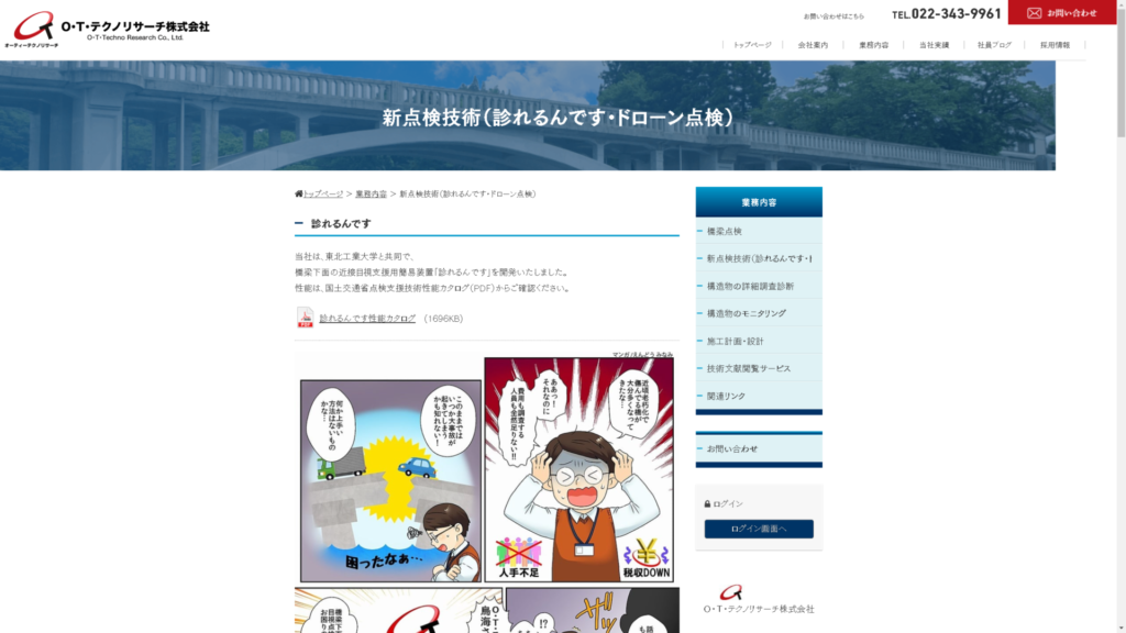 ドローン点検 橋梁点検時の近接目視手段としてドローンの導入にチャレンジしています。座学や飛行訓練を実施し、点検員自ら画像を撮ることにより、点検効率の向上を目指しています。全方位衝突防止センサー搭載ドローンで狭隘空間に侵入 … 続きを読む O・T・テクノリサーチ株式会社